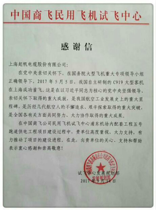感謝上海起帆電纜對C919試飛成功的大力支持